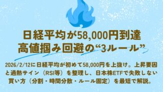 2026/2/12に日経平均が初めて58,000を上抜け。上昇要因と過熱サイン(RSI等)を整理し、日本株ETFで失敗しない買い方(分割・時間分散・ルール固定)を最短で解説。
