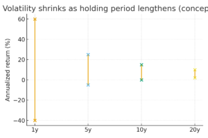 長期になるほど、年率リターンの最高値〜最低値のレンジ(振れ幅)が縮むのが歴史データの定番パターン。J.P.モルガンの「Guide to the Markets」でも、1年<5年<10年<20年と、期間が長いほど“最悪ケース”が改善していく図表が示されています。 JPMorgan+2JPMorgan+2