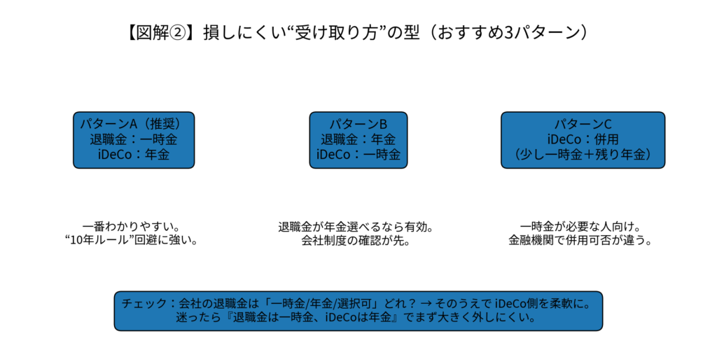 | 退職金:一時金 / iDeCo:年金 | 受けにくい | 一番わかりやすい回避策 |