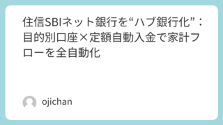 お金 住信SBIネット銀行を“ハブ銀行化”:目的別口座×定額自動入金で家計フローを全自動化 住信SBIネット銀行を“ハブ”にして、他行→自動入金→目的別口座へ自動仕分け→家賃等の自動振込まで放置で回す方法をテンプレ付きで解説。 2025.09.29 お金家計管理銀行活用